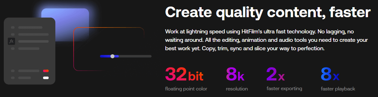 - 기본 설정으로도 HitFilm Express의 주요 기능을 모두 사용할 수 있습니다.