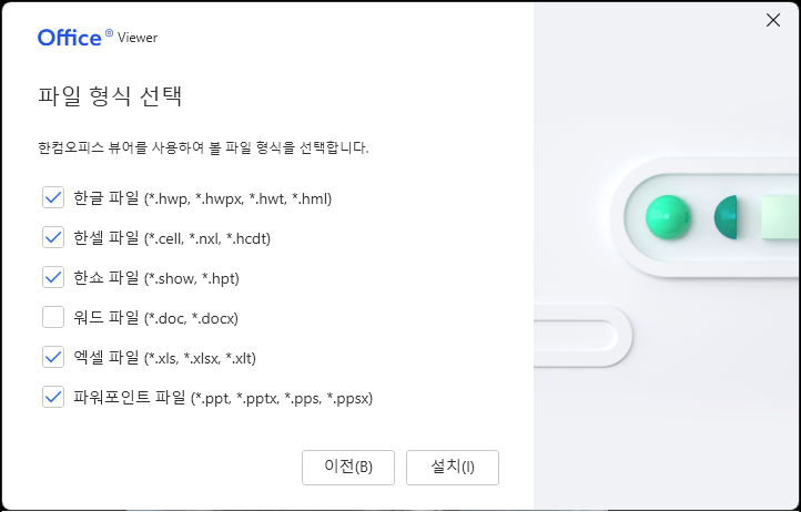 정식으로 설치가 시작됩니다. 파일형식의 선택이 나오면 본인에게 맞는 것만 선택하여 설치합니다.